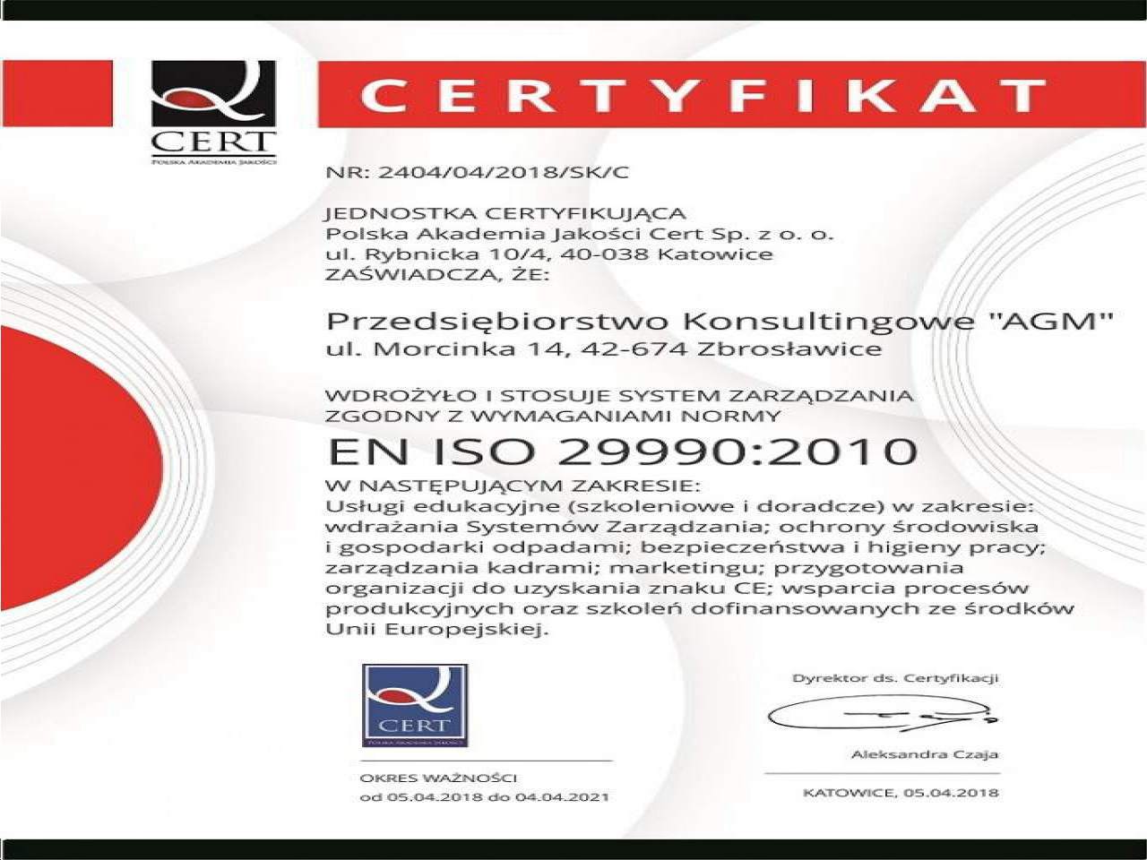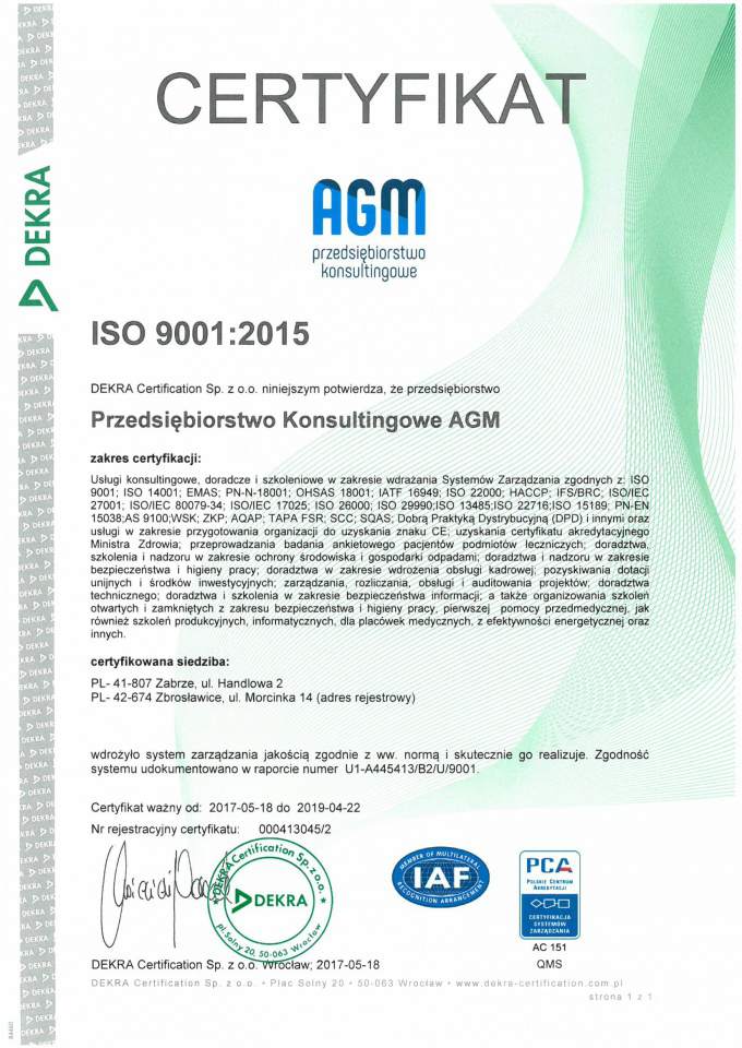 Zajmujemy się działalnością konsultingową na terenie całej Polski, związaną z doradztwem biznesowym. Świadczymy usługi w obszarach projektowania, wdrażania i szkolenia w zakresie Systemów ISO, pozyskiwaniem dotacji unijnych, Ochroną Danych Osobowych - RODO, BHP, KADR oraz doradztwem środowiskowym. Właścicielem firmy AGM jest Grzegorz Kłunduk, a nasza siedziba znajduje się w Zabrzu.
